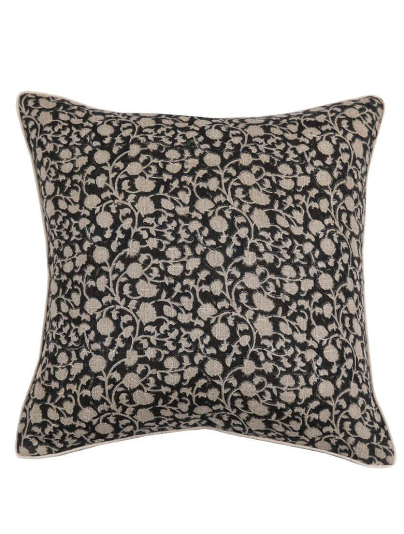 Beautiful hand block printed pillow on linen fabric featuring a floral pattern. Cotton backing. Zipper closure. Pillow cover only.