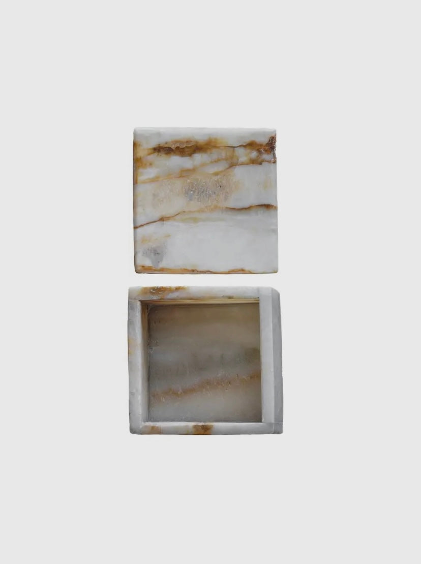 Crafted from brown onyx, which is plush with white and tawny brown banding, this box is an attractive storage accent. Each piece is unique based on the stone's natural appearance.